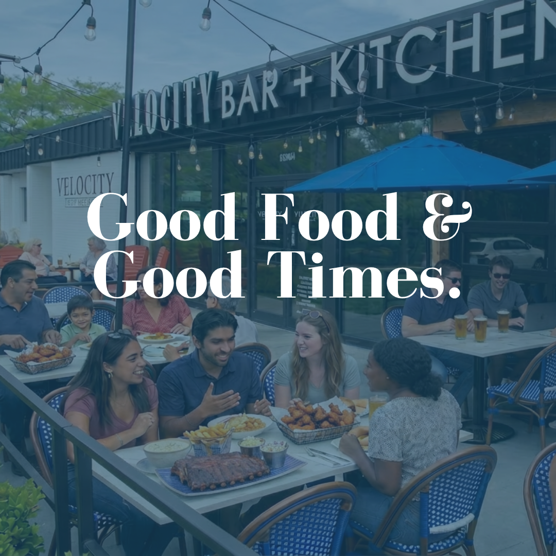 Just a stone's throw from George Mason University in the heart of Fairfax, Velocity Bar and Kitchen is your go-to spot for award-winning wings, high-quality drinks, and a menu worth coming back for. Our garage doors open straight to the main bar, and the expansive covered and outdoor patio keeps the energy going rain or shine. With live music programming, weekly specials Monday through Thursday, and private dining and catering options available, there's always a reason to come back.